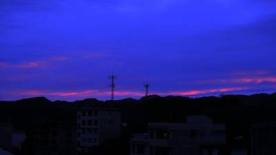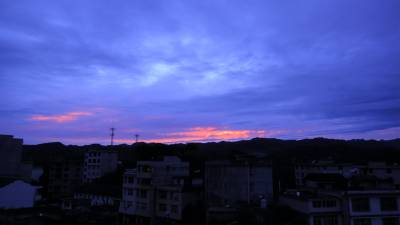 7月15日,雨后夜幕降临,登楼远眺,西方晚霞与天空呈现红与蓝美景,使人陶醉。