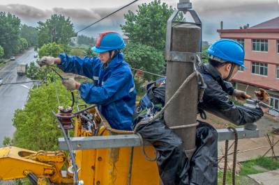 7月15日晚间,黄冈地区遭遇雷暴雨天气,造成10条10千伏线路跳闸停运,128个供电台区,9053户用户停电。出现灾情后,黄冈供电公司反应迅速,16日凌晨就指派工作人员冒雨巡线查找故障点,命令各抢修单位集合人员、清理物资整装待发。经过紧张冒雨抢修,截止16日下午14:45黄冈地区已修复10千伏线路9条,低压供电台区119个,8531户用户恢复正常供电。期间,黄冈供电公司共出动抢修人员58人次,抢修车辆22台次。预计其余受灾停电线路台区今晚18:00前可回复正常供电。图为:黄冈供电公司检修分公司配电运检室员工正在抢修被雷击线路。