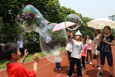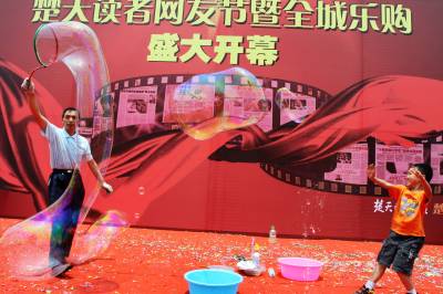武汉:中年男子表演吹泡泡 与观众共享童真快乐