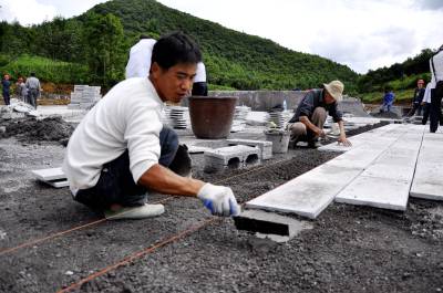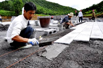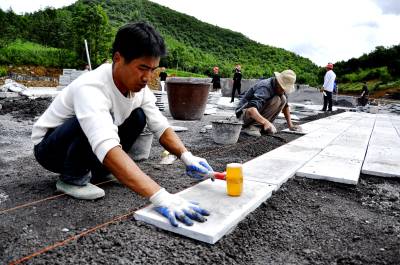女儿会广场建成了 7月16日,在恩施市红土乡石窑集镇,工人正在铺设女儿会广场地板砖。 石窑是恩施女儿会故乡。该乡通过招商引资方式,筹措资金3000多万元,修建女儿会广场,占地面积4500多平方米。建成后既是老百姓休闲、娱乐、健康好去处,又为打造美丽石窑风情小镇增添了一景。预计今年农历七月十二日前可以投入使用。(视界网 彭绍峰 梅德海摄)