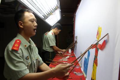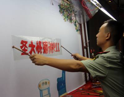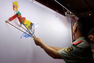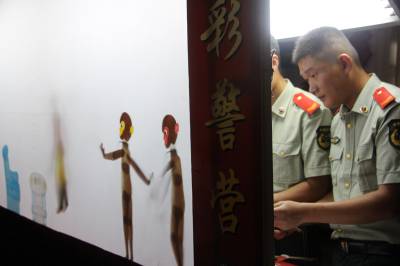云梦县是湖北省著名的皮影之乡,云梦县皮影戏入选第三批国家级非物质文化遗产名录,云梦皮影秦礼刚是国家级非物质文化遗产项目代表性传承人。为弘扬民族文化,学习传承非物质文化遗产,宣传、普及消防知识,丰富警营文化生活,云梦消防大队邀请皮影大师到警营为官兵带徒传艺。在秦礼刚师傅的指导下,官兵们结合消防工作实际,自编自演现代皮影戏《119折服孙大圣》,多次在云梦及外地演出,受到警营官兵和社会各界的一致好评和欢迎。皮影进警营,成为云梦消防的一大文化品牌,多次获得奖励。 本报视界网 陈保忠 摄