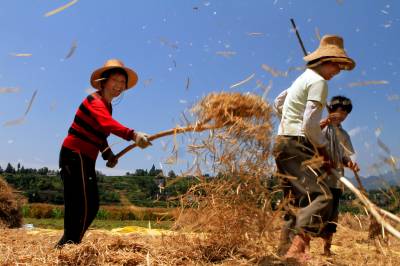建始县长梁乡白云村十组农民正在抢收油菜。国家的惠农政策极大的增强了农民种粮积极性,丰收的喜悦洋溢在脸上。