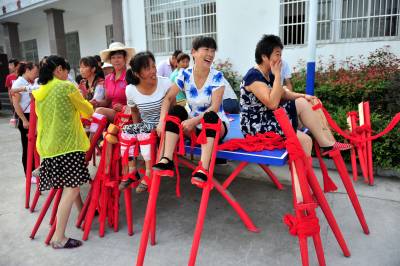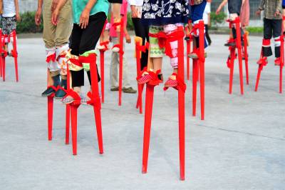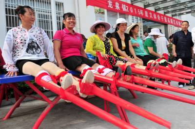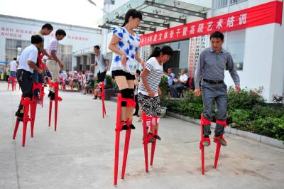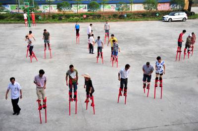 2015年7月18日,宜昌市夷陵区龙泉镇村民在练习民间高跷的走踩技巧。连日来,时值盛夏伏天,宜昌市夷陵区龙泉镇的老百姓不畏酷暑,全镇各村(社区)的近百名爱好传统文化的村民代表和文体骨干聚集在青龙村委会广场,发展兴起“高大上”的传统文化体育运动,将高跷这种民间传统技艺加以传承和保护。