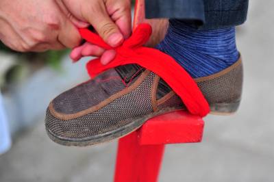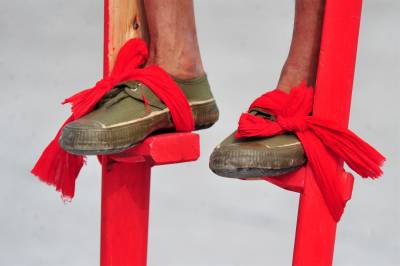 高跷表演形式有“踩街”和“撂场”两种,撂场有舞队集体边舞边走各种队形图案的“大场”和两三人表演的“小场”,角色间多男女对舞,有时边舞边唱。从表演风格上又分为“文跷”和“武跷”,文跷重扭踩和情节表演,武跷重炫技功夫。视界网 张国荣 摄