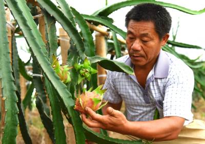 17日,嘉鱼新街镇晒甲山村4组菜农徐武常望着自家大棚内,试种火龙果结果,心里甜滋滋的,悬着心安定了。徐武常 45岁是地道农民,有大棚20个面积共30亩,其中火龙果大棚2个,草莓大棚8个,其余为蔬菜大棚,近几年,他每年都参加镇、县主办的现代农民培训,总想在大棚里搞点“明堂”2014年他被省农业厅授予农业技术推广“明星科技示范户”。龙果属热带、亚热带水果,火龙果营养丰富、功能独特,它含有一般植物少有的植物性白蛋白以及花青素,丰富的维生素和水溶性膳食纤维。火龙果属于凉性水果。
