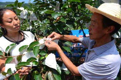 7月20日,建始县红岩寺镇益农专业合作社负责人米绪东在甜柿园里指导果农套袋技术。今年,该县通过专业合作社引领,在挂果的万亩甜柿园里大力推广甜柿套袋技术,远远望去,像一片盛开的“梨花”。此举既增产又提质,使甜柿产业成为农民增收的甜蜜“柿”业,受到果农真心欢迎。本报视界网刘波摄 建始县新闻中心刘波联系电话13032794298