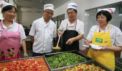 7月21日,湖北省武穴市理工中专后勤总务主任宋立新(左二),正与炊事班师傅研究食材合理搭配,保证来自各地大学生们吃得饱,吃得好!刚过七月,正当别的学校准备放假休息,武穴市理工中专接到一个新任务:安排好来自华中农业大学、中南民族大学、湖北工业大学和黄冈师范学院近200名前来武穴实习实训的大学生后勤保障工作,该校立即组织精干后勤人员,精心为他们组织好吃、住、行后勤系列服务,得到上级有关部门以及校方充分肯定!视界网冯怡红摄