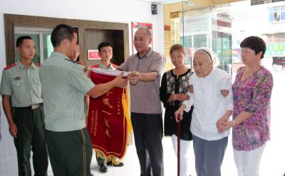 7月22日,湖北省十堰市郧阳区城关镇居民孟承伟带着母亲王世英到区消防大队送上写有“军民一家亲”的锦旗。王世英今年103岁,曾送五个子女参军,属军人家属,逢年过节,区消防大队都会组织官兵去她家慰问。为表达谢意,王世英曾多次叮嘱儿子带上她去消防队送一面锦旗。至此也了却了王世英老人家的一桩心愿。(视界网 曹忠宏 摄)