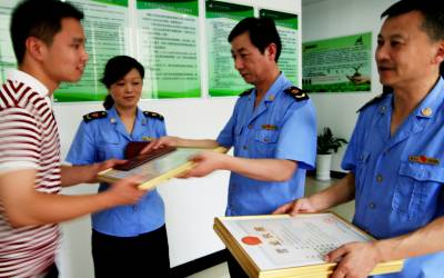 7月22日,湖北省武穴市工商局开发区工商所干部,将3个工作日内快速办好的30多本入驻大学生创业孵化基地的营业执照送到申请人手中。武穴市政府出台系列优惠政策鼓励大学生创新创业,激发了武穴籍大学生的创业热情,市政府及时出资280万元将2000平方米闲置场地进行改建成可容纳42个创业项目入驻的大学生创业孵化基地,人力资源和社会保障积极宣传组织,工商部门特事特办,大开方便之门。到目前为止,基地已入驻创业项目含电子商务、室内装潢景观设计、网络信息技术服务、文化传媒创意等实体35家,入驻率达71.4%。视界网 冯怡红摄
