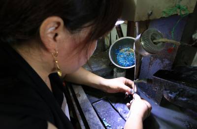 7月23日,在竹山县宝丰镇红星珠宝工艺苑,女工们正在忙碌着加工绿松石。竹山县是著名的“东方绿松石之乡”,绿松石地质总储量约为5万吨,其储量和品质均居世界之首。近年来,该县把绿松石产业作为增加地方财源、解决群众就业、扩大出口创汇和提高地方知名度的骨干产业来培植。按照合理开发、永续利用的方针,制定了绿松石产业发展规划。支持绿松石加工企业进行技术改造,提升产品质量和档次,全县绿松石形成了雕件、挂件和工艺首饰品等三大系列产品。举办绿松石雕刻等多项技能加工培训,让全县2000余名农家妇女在家门口“领薪” 。