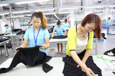 图二:青年农民工杨丽正在检查她亲手生产的第一件成衣