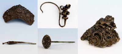 咸丰发现一明代早期墓葬(图) 24日拍摄的咸丰县高乐山镇小模村一座明代墓葬出土的精美陪葬饰品。 据了解,此墓葬位于一当地建筑工地内,施工人员发现后第一时间上报给咸丰县文物事业管理局,该县文化综合执法大队迅速对施工现场予以保护,并上报至省考古研究所。 专家介绍,此墓葬为明代早期夫妻合葬墓,属散毛土司属地,保存相对完整,对研究当地明代时期土司文化及土司民俗,具有重要的历史价值和学术价值。(视界网马辉、蒲元浩 摄)