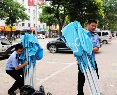 7月27日, 十堰市郧阳区执法局柳陂分局执法分局与各部门联合对商业街100多家门店个别出店经营户进行整改,并向业主发放"五城"联创倡议书,动员商户业主积极参与"门前"三包和创建国家级"文明"、"卫生"、"森林"、"生态"和"环保"城市建设活动中来。 视界网周家山 摄