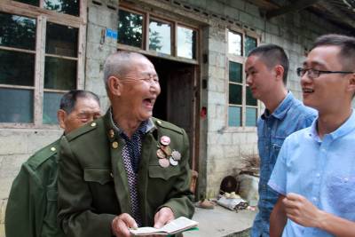 “八一”来临之际,为让老兵过上一个快乐幸福的军节,7月27日下午,鹤峰县烟草专卖局青年志愿服务队员专程来到该县太坪镇毛坝村五组抗美援朝老兵李官政、廖明清家中慰问,老兵脸上绽放着幸福的笑容。(王群拍摄报道)