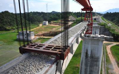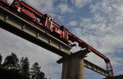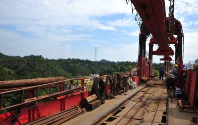 宜万铁路采取东、西相向同时铺轨,从2008年3月开始铺轨,东段由中铁四局负责施工,目前已铺轨到恩施市,全长216公里;西段由中铁三局负责施工,目前已铺轨63公里,全线还剩最后98公里没有铺轨。目前,各施工队伍正加紧施工,预计今年8月底完成全线铺轨任务。宜万铁路东起湖北宜昌,西至重庆万州,全长377公里,沿途地质条件复杂,施工十分困难,共有隧道159座、桥梁253座,桥隧占线路总长的74%。