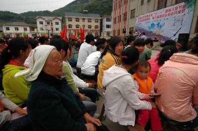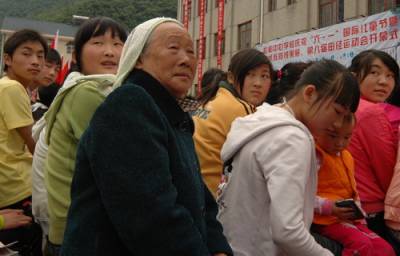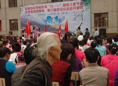 31日,神农架林区松柏中心学校举办庆祝”六一”国际儿童节,附近的村民都赶到学校祝贺这个本来属于小朋友的节日。图为泮水村村民在学生一起过”六一”国际儿童节。