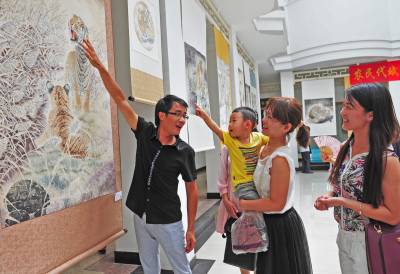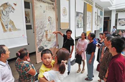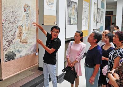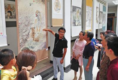 7月29日,湖北省宜都市聂家河镇农民“画家”代斌在向参观虎画展的观众讲解老虎的生活习性,并宣传保护动物的相关知识。代斌是宜都市聂家河镇地道的农民,自幼喜爱绘画,他从三峡工艺美术学校毕业后,就外出到处拜师学艺,并到河南民权画虎村向那里的农民画家学习工笔猛兽画技法,获得多名画虎名家的指点,他结合自己的绘画特点,形成独特的画虎风格。在展出的40多幅虎画中,有的凶猛异常,有的和蔼可亲,有的憨态可掬,有的嬉戏打闹,千奇百怪、多姿多彩,深受观众喜爱。在展览现场,代斌说:今天是“世界爱虎日”,目前,全球野生虎数量从