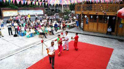 咸丰向违规整酒说“NO” 7月29日,咸丰县高乐山镇官田坝村村民在表演民间曲艺三句半《狠杀整酒风》。 为杜绝“谢师宴”、“升学酒”等违规整酒风抬头,民间艺人把操办婚丧喜庆事宜程序、违规整酒的规定用群众喜闻乐见的文艺节目形式,自编自导自演多个文艺节目进院落宣传,受到群众好评。村民们纷纷表示:“违规整酒害死人,切莫参与无事酒。”(视界网 宋海燕、程华选、邓宏娟 摄)
