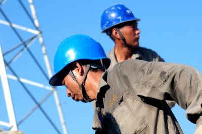 7月29日,老河口市供电公司施工人员奋战在高温下的田野间,对10千伏光化线西70线路的1至3号杆进行迁移,为线下正在建设中的养老院“让道”,让养老院有了更安全更可靠的用电环境。图为该公司施工人员在现场工作。