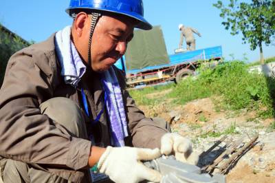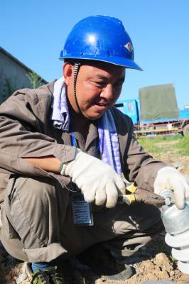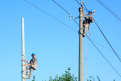 7月29日,湖北老河口市供电公司施工人员奋战在高温下的田野间,对10千伏光化线西70线路的1至3号杆进行迁移,为线下正在建设中的养老院“让道”,让养老院有了更安全更可靠的用电环境。图为该公司施工人员在现场工作。