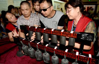 7月30日,盲人朋友在市博物馆触摸曾侯乙编钟复制件。当日,省博物馆与市博物馆、市残联等单位联合举办了“让我的声音做你的眼睛”关爱盲人系列教育活动,10名盲人朋友在志愿者的陪护下聆听楚文物的历史知识、触摸体验编钟的神奇、聆听千古绝响的美妙。记者李文勇通讯员姚香明摄