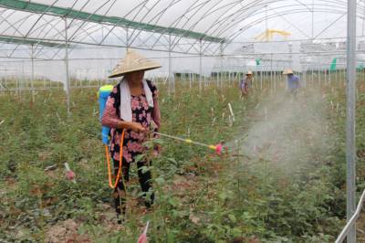 7月31日,在来凤县翔凤镇马家园村玫瑰花种植基地里,腾升花卉园艺专业合作社管理人员正在为玫瑰花喷农药。该合作社成立于2014年,流转土地100余亩,主要种植玫瑰花等花卉。玫瑰精油用于生产高品质香水、化妆品、食品添加剂等,其价格昂贵,有“液体黄金”之称。因此,种植玫瑰花并对其进行深加工,前景十分看好。 (湖北图片库 邱俊杰 摄)