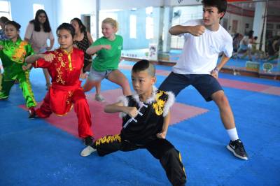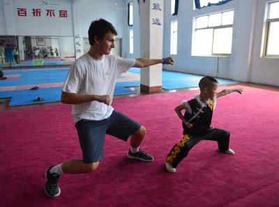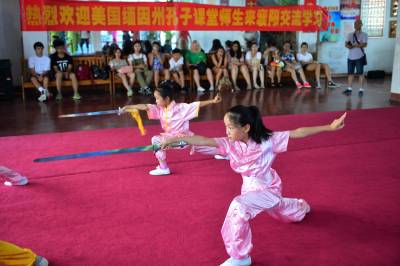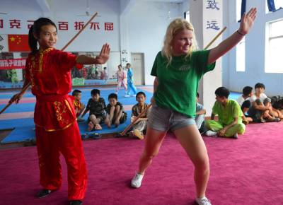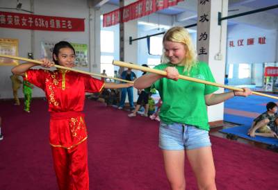 8月1日,在襄阳一家武馆,美国缅因州中国语言文化中心及孔子课堂的8名美国学生,向襄阳习武的孩子学习中国功夫。这些美国孩子通过湖北汤姆留学服务有限公司,利用暑假来到湖北,入住在襄阳普通市民家中,开始“游学+体验”的襄阳古城之旅,感受中国文化魅力。 视界网 谢勇 摄
