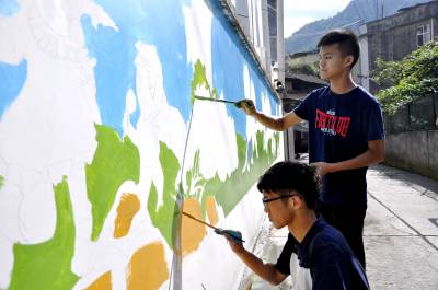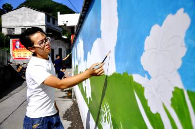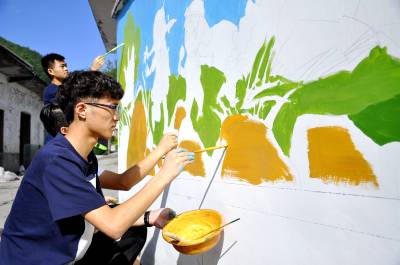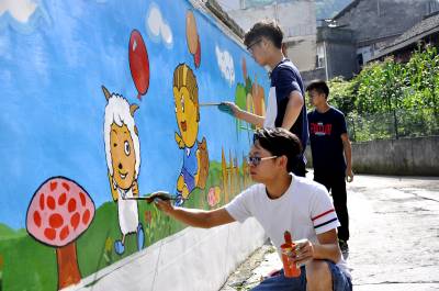 8月2日,在恩施市红土乡爱立幼儿园门前,大学生志愿者正在专注地画墙绘。