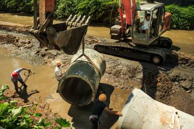 8月2日,恩施市河流治污施工队的师傅们正冒着高温,在清江支流龙洞河上安装排污管道。今年,恩施市政府投资近四千万元,对长期污染严重的清江支流龙洞河进行治理。工期三个月,目前正抓紧施工,预计今年十月中旬完工。