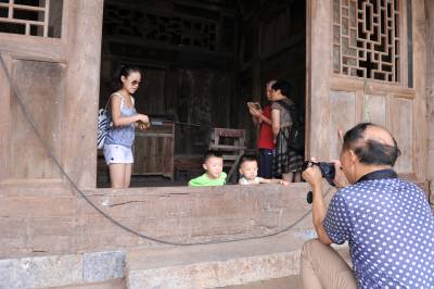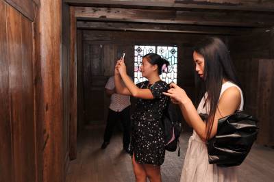 8月3日,游人在湖北恩施林博园内观赏金丝楠木民居。