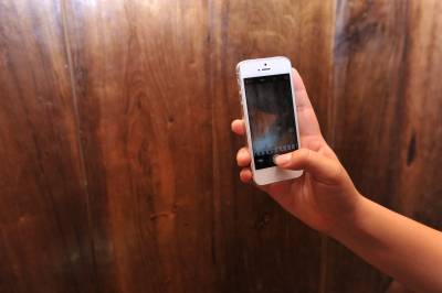 8月3日,一位游人在湖北恩施林博园内用手机观赏金丝楠木民居。