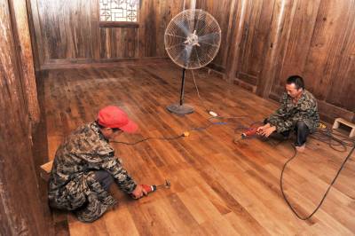 8月3日,工人在湖北恩施林博园内,对金丝楠木民居进行打磨。