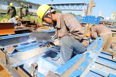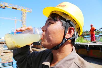 蒙西华中铁路公安长江大桥工地承台、墩身、墩帽及悬浇梁等均采用钢模板施工,钢模板加工量近1000吨。钢结构加工厂的工人们每天起早贪黑,虽然错开中午高温时段,但下午4点后的气温仍高达38℃以上。三伏天热,三伏天的电焊工更热,他们只要走进加工厂,手持电焊枪,就是满头大汗,身上的衣服没有一处是干的,他们对工作是如此的专注、敬业,用辛勤的汗水诠释着大桥人“敢于吃苦、敢于挑战、乐于奉献”的精神。