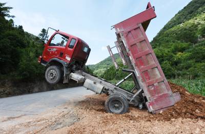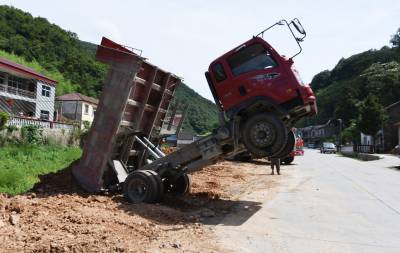 保康一名货车驾驶员忙中出错 货车自卸土方车头失重被