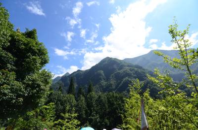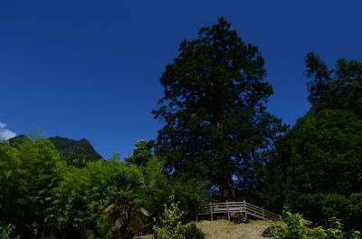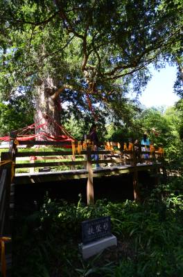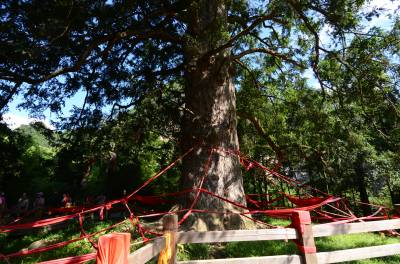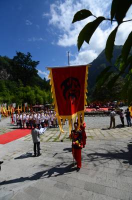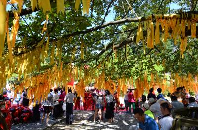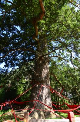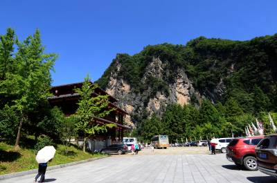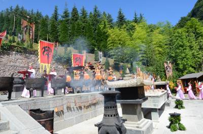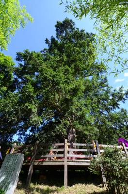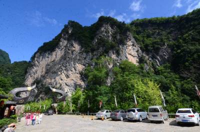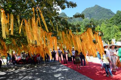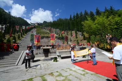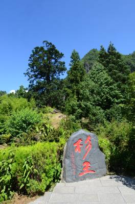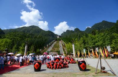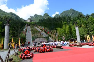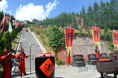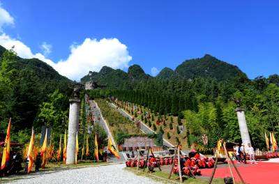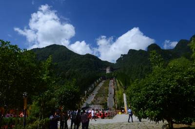 登高243级台阶,便来到了天坛神农雕像前的瞻仰台。仰望神农塑像,牛首人身,双目微闭,威武古朴,似在静静地思索宇宙。塑像不设底座,身驱拔地而起,头顶蓝天,身披彩云。神农雕像高21米,宽35米,相加为56米,象征中华56个民族欣欣向荣,子孙繁衍兴旺之意。