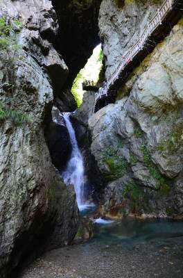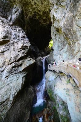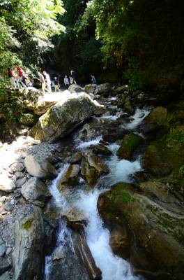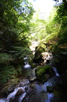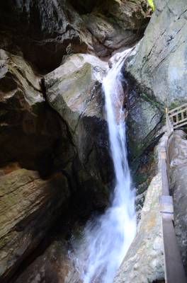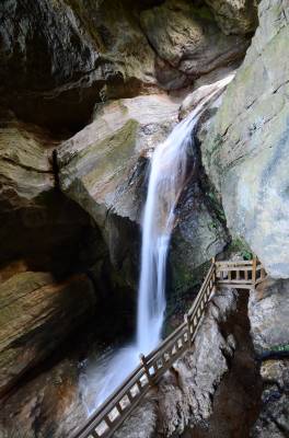 神农架天生桥景区位于神农架南部的老君山北麓,发源于老君山的黄岩河流经此地,经过亿万年地表水和地下水的流动、溶蚀,形成一岩溶性天生穿洞,呈葫芦状,高约17米,河水穿洞下泻,使黄岩河两岸一桥横贯东西,呈现出“天桥飞渡 ”,故名天生桥。