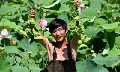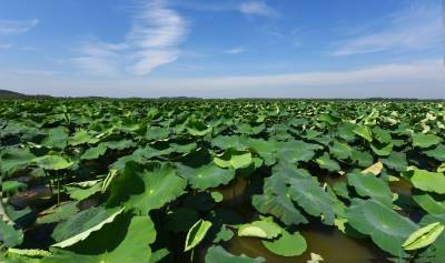 8月5日,湖北嘉鱼珍湖满湖荷叶摇曳,乘船划行在碧浪里,到处都是丰收的景象,3800亩莲藕,新藕已长到三节。