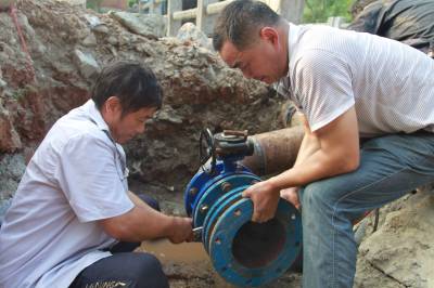 8月5日,丹江口市自来水公司员工正在给央企文字六零五厂碰头接水。,为方便央企文字六零五厂25栋居民用水,丹江口市自来水公司员工不顾天气炎热 ,为该厂职工家属楼一户一表制自来水户改。十堰日报记者 齐海燕 通讯员 金志 摄
