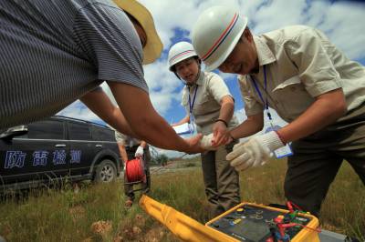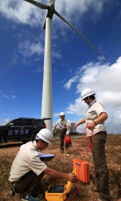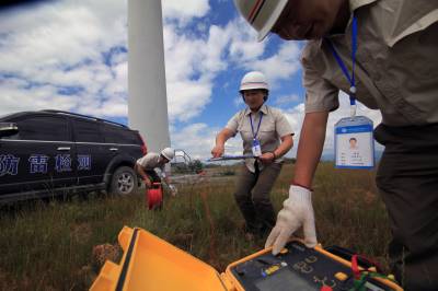 8月4日,湖北利川市气象局防雷检测技术工程师郑琦(女)、张成平等顶烈日在对齐岳山风力发电机进行防雷电抽样检测。据悉,利川市风力资源极为丰富,风力发电蕴藏量近百万千瓦,该工程分为三期开发,自齐岳山风力发电场(49.3MW)工程首台风力发电机组于2010年12月10日并网发电以来,基地先后投资20多个亿安装风力发电机179台,被省内外专家誉为华中第一大型风电场,气象部门对此重大工程开展防雷检测专项服务十余年如一日。