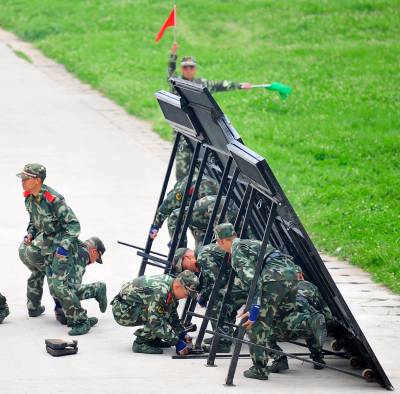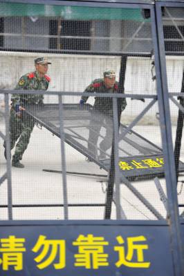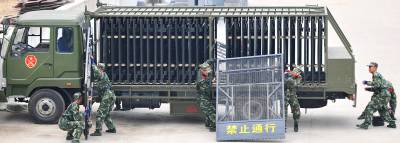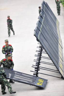 ”嫌疑人驾卡车正朝这边驾来,预计20分钟到达。””立即实施阻拦!” 一辆载有32块阻车板的武警阻截车飞速驶到预定地点,10名战士一拥而上,抽板、展开、架设、固定,整套动作一气呵成,仅12分30秒,一道屏障截断了45米宽的大路,印有”禁止通行”的阻拦板威武严肃。 这是5月31日在武警湖北总队一支队训练场上出现的一幕。武警湖北总队一支队参谋长李向阳介绍,为适应近年来不断变化的社会形势,支队新组建了”阻截”分队,配备专业”阻截车”,每辆车上装载32块阻车板,每块板重约75公斤,板上装有锯齿,铁钉等防卫部件,不仅可用于大型广场的安全保卫,也可应对阻截嫌疑人驾车逃跑,抗击大型车辆冲关闯卡等突发事件。