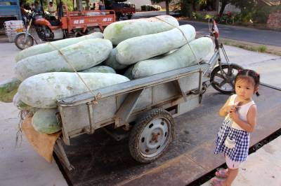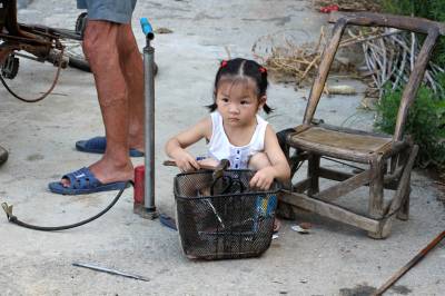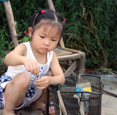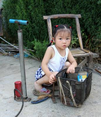 小女孩很乖巧,很会自己玩。姥姥去帮人抬大冬瓜,小文俊也跟着姥姥去看大冬瓜。一会又到姥姥修车的地方玩。笔者告诉小女孩,我要走了。小女孩忙说:你不走!你不走!