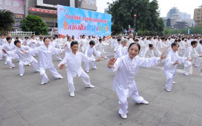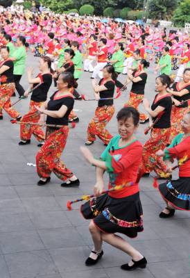 8月8日,市民在广场打太极拳。(跳土家莲香舞健身)