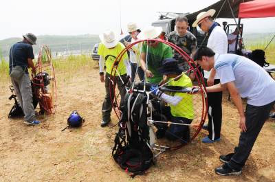 8月8日, 武汉市羽人滑翔伞倶乐部与十堰市滑翔伞倶乐部汇集郧阳区汉江南岸,共同切磋交流滑翔伞飞行技艺,10具滑翔伞在山顶轮流交替滑翔,2具动力伞在汉江上空飞翔,极限运动己在山区汽车城蓬勃兴起。 视界网周家山 摄