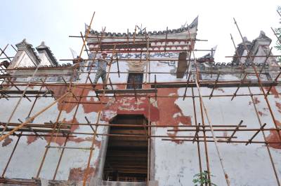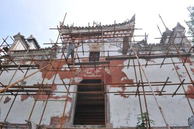 8月10日,工人在对州城武圣宫进行维修。