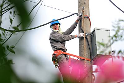 8月10日,老河口市最高气温达到35摄氏度,电杆表面温度近60摄氏度。在该市贾沟村,来自老河口市供电公司客户服务中心的电力员工登上电杆,更换下火电缆,安装分电箱,为该村解决用电卡口问题。图为电力员工在登杆作业。