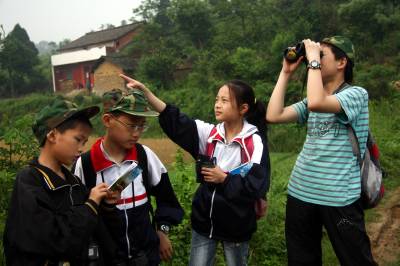 京山县三阳镇良好的生态环境,成为为数不多的省内观鸟基地。图为5月29日,该镇小学同学跟随观鸟爱好者一道,在湖北省第三届野生鸟类摄影暨观鸟比赛期间,利用双休去参加户外观鸟活动。(翟存波摄)