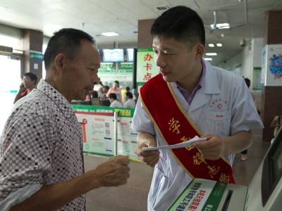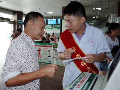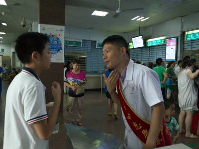 8月11日下午,宜昌市中心人民医院的新职工刘强博士,身披学雷锋志愿者绶带,在门诊大厅为患者导医。该院自去年9月起,推行新职工导医服务,帮助新医生提高与患者沟通的能力,上好入职第一课。