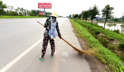 11日,记者在武嘉公路上好奇一组烈日下清扫镜头,怎么荒野城外公路上还有人保洁,一打听才知她叫李巧英69岁,是嘉鱼县新街镇晒甲山村农民,去年12月被镇聘请卫生保洁员,每天保洁6.5小时,月工资1600元,家里还种了3亩地。据悉全镇聘请卫生保洁员27名。