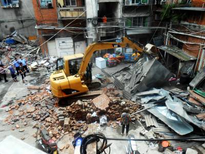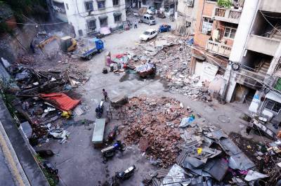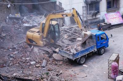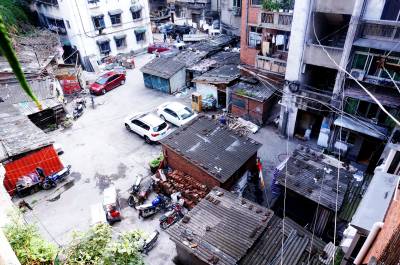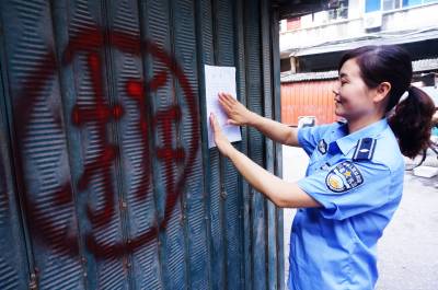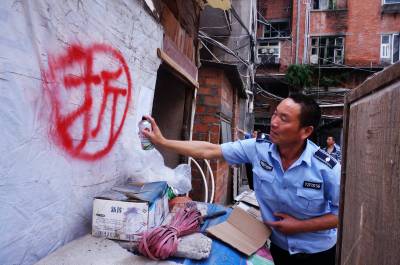 8月11日, 十堰市郧阳区执法局组织100多名执法人员和志愿者依法强制拆除原福星商场家属院内27户300多平方米乱搭乱建棚屋和焊制的铁皮房,清除建筑拉圾后将建社区绿地、停车场,安装健身器,还社区居民娱乐休闭空间。彻底改变该院区出租乱塔乱建房屋加工制作食品的脏、乱、差格局,让多年上访违建一朝拆除还绿。 视界网周家山 李磊摄