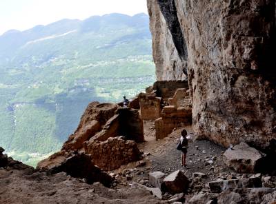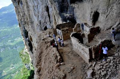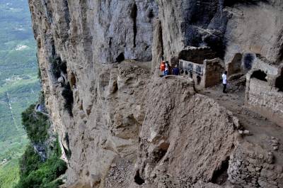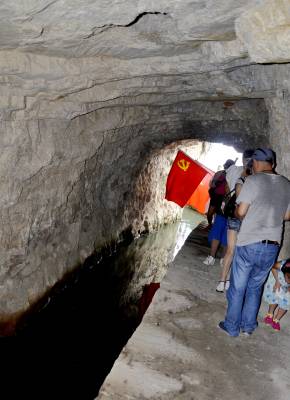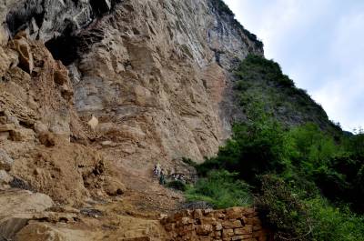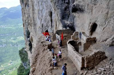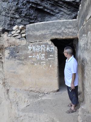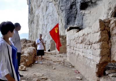 大家徒步探访了绝壁上和隧道里的灌渠,又爬上灌渠上方约150米处的当年修灌渠时几百民工吃饭睡觉的地方—硝洞岩。看到民工们曾经做饭的灶台、睡觉的石板、标语的字迹以及指挥长办公洞口,大家无不为那段艰苦而光辉的岁月所震撼。